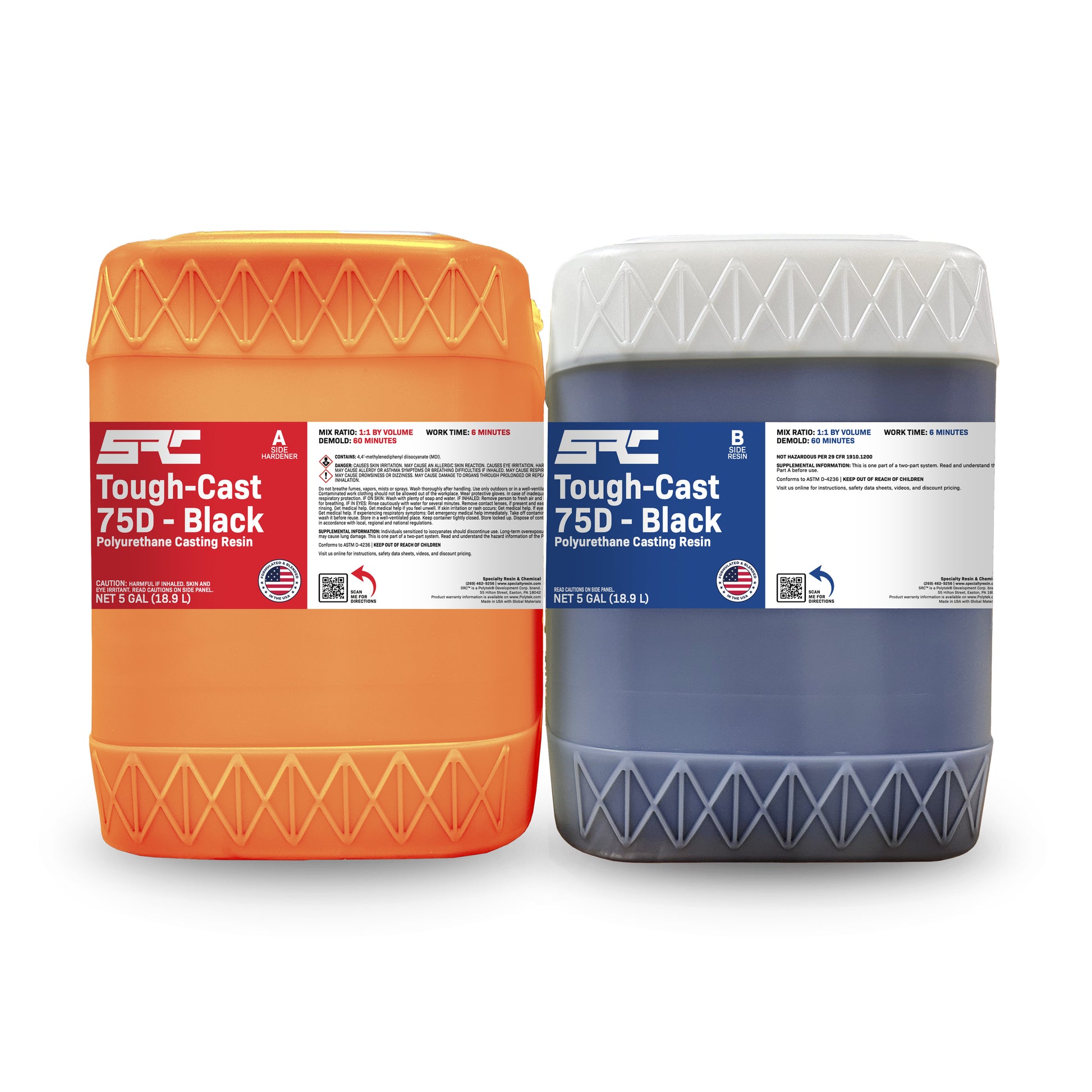 Tough-Cast 75D Black is an incredibly strong and durable 1:1 ratio two-component polyurethane casting resin. It features high impact resistance, strength, and chemical resistance.