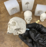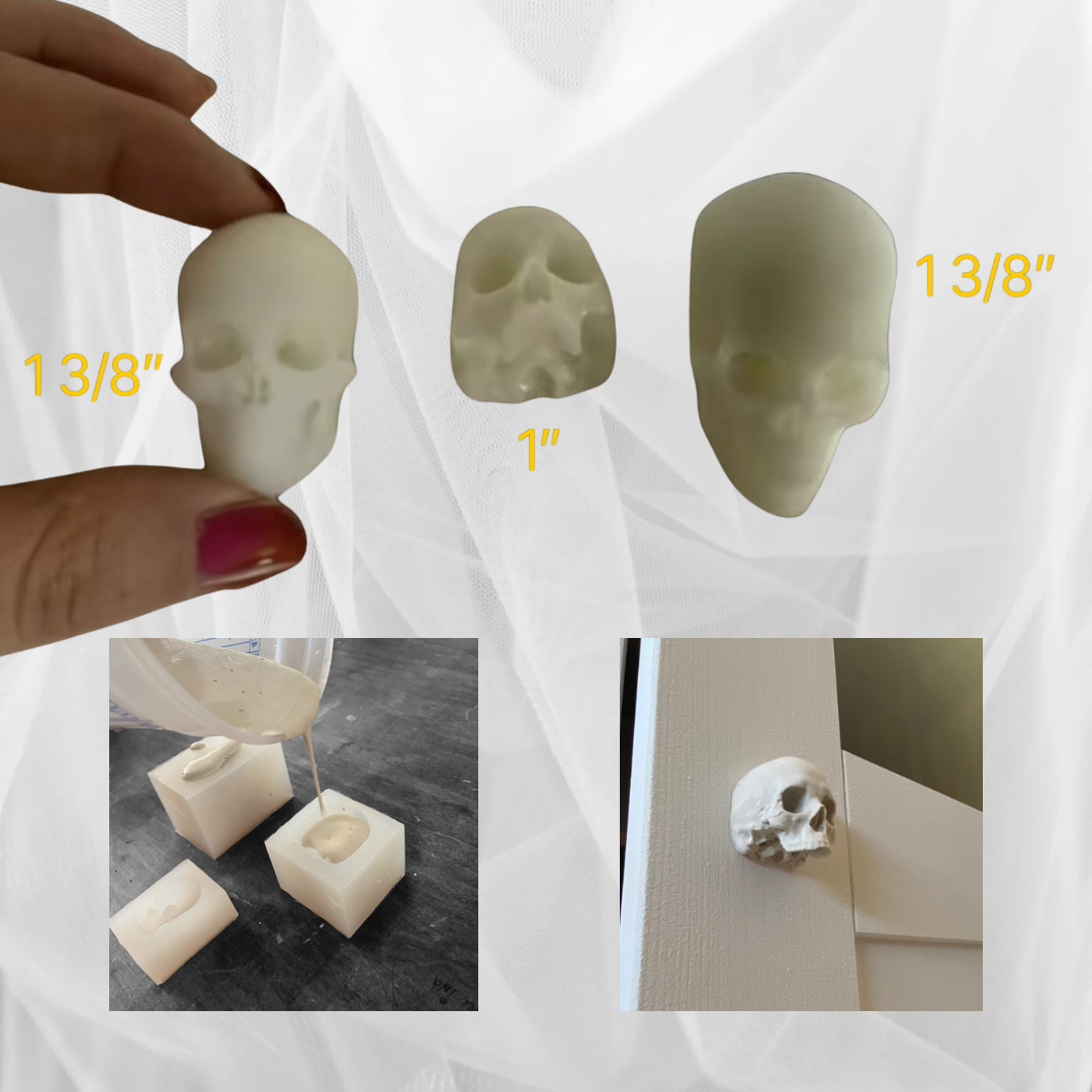 Cast miniature skulls using all sorts of mediums in our silicone molds. Sold as a set of 3, full skull, full flat back skull and half flat back skull w/o mandible.